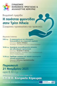 Την Παρασκευή 21 Νοεμβρίου 2025, το προσωπικό των δομών ΚΗΦΗ Κεντρικής Κέρκυρας, ΚΗΦΗ Βόρειας Κέρκυρας και ΚΑΠΗ Κεντρικής Κέρκυρας θα συμμετάσχει σε επιμορφωτική – βιωματική ημερίδα με τίτλο: